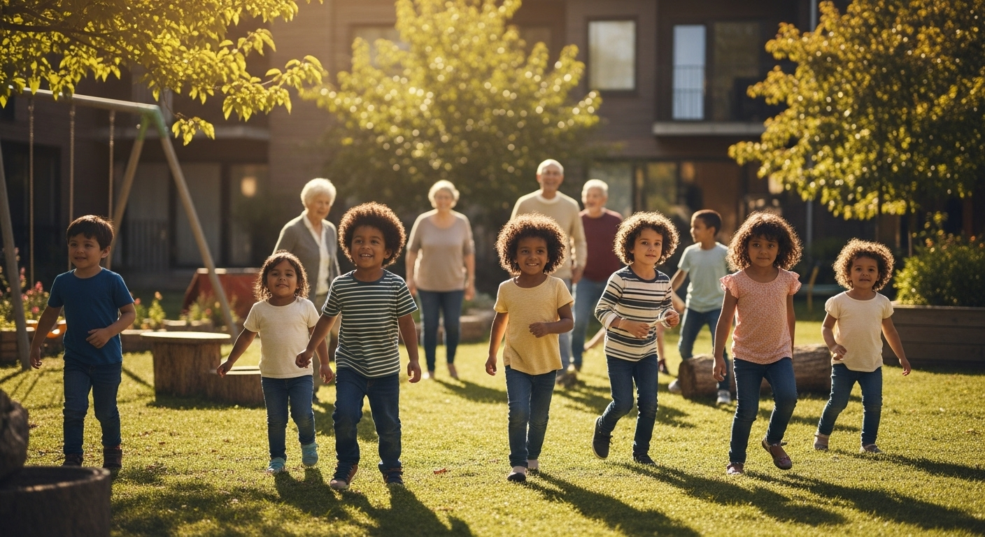 Crescer em um Cohousing Multigeracional é como ter uma aldeia inteira como quintal. As crianças convivem com múltiplos “tios” e “avós”, aprendem com a diversidade e brincam com mais liberdade e segurança. É um ambiente que estimula o desenvolvimento social, a empatia e o respeito pelas diferenças desde cedo.